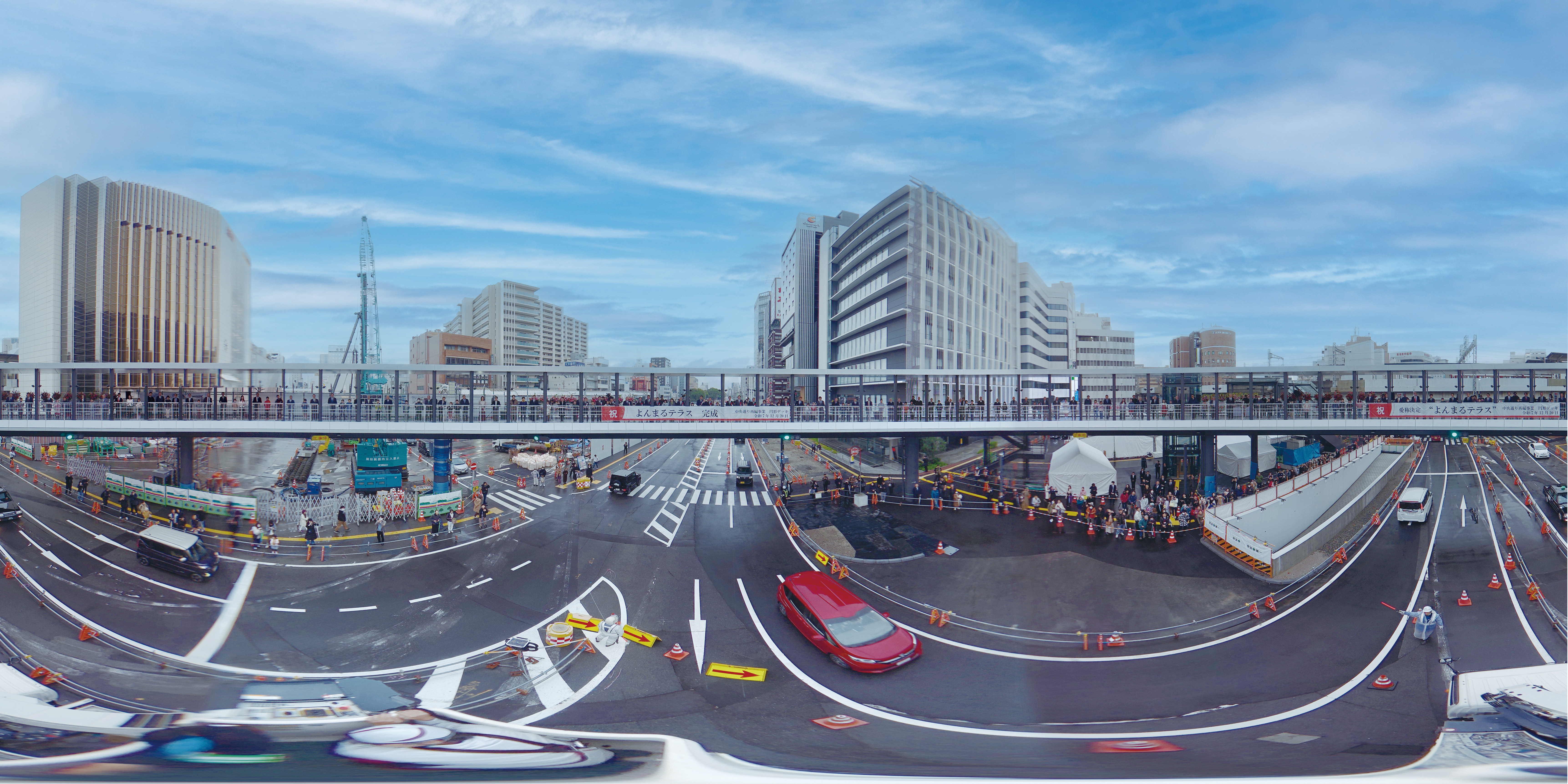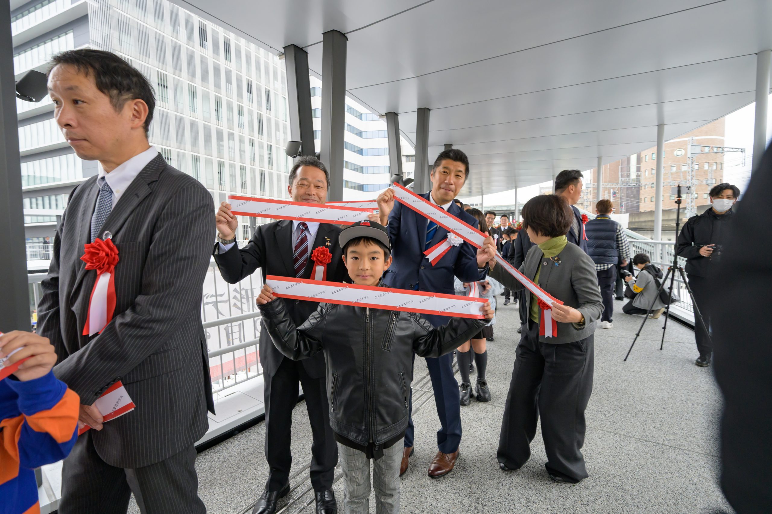 また、供用に先立ち、同日に開催された完成式典では、約10,000件の中から選ばれた愛称「よんまるテラス」が発表されるとともに、円形デッキ上でみんなで輪になってテープカットを行いました。