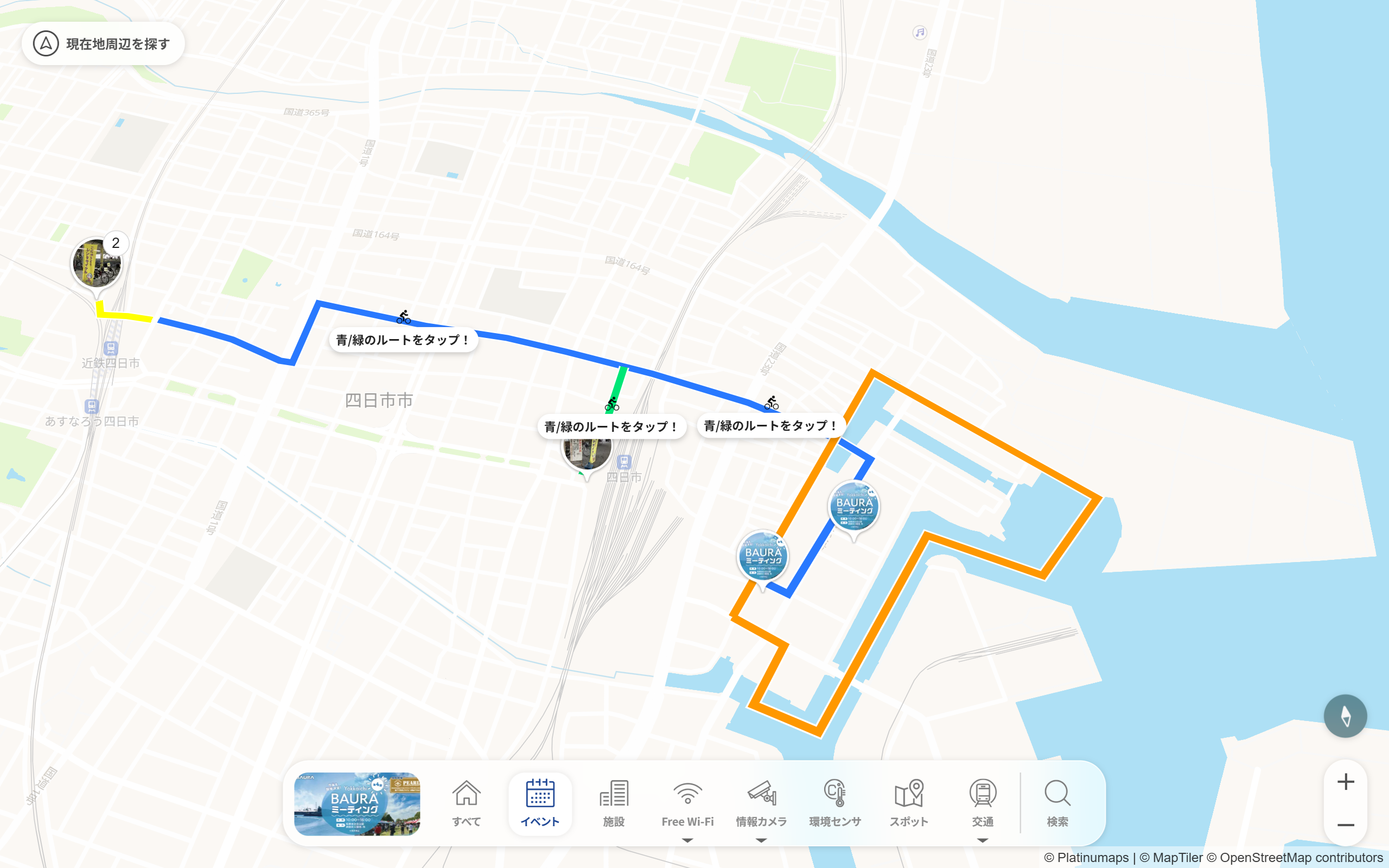 四日市デジタルマップでは、会場までの推奨ルートや会場駐輪場、中央通りを中心に四日市市の様々な情報が掲載されています。会場までのサイクリングルートを確認しながら、イベント以外の四日市の魅力を探してみてください!